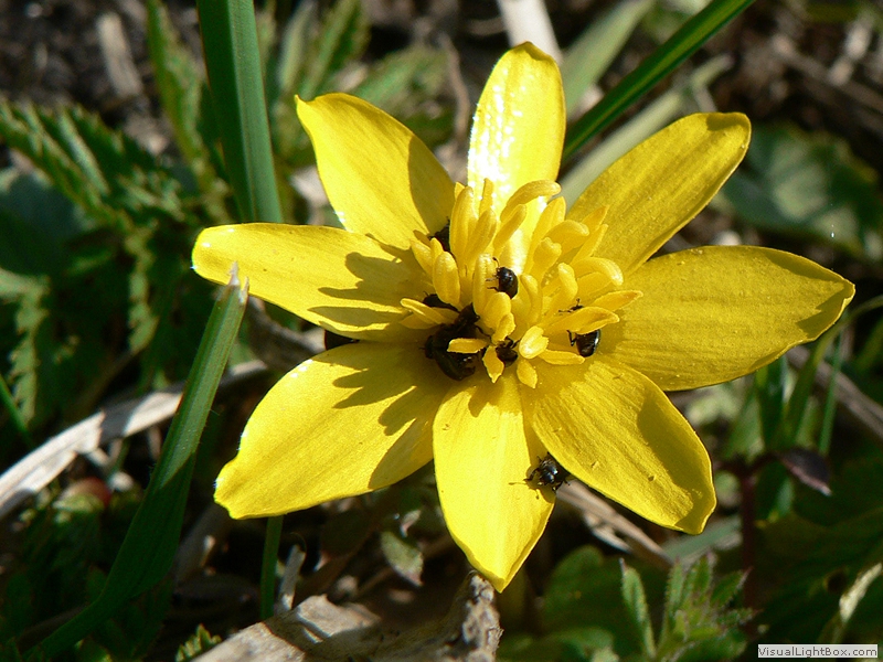 stehende, lang gestielte sternförmigen Blüten mit acht bis elf Kronblättern, die auffällige goldgelbe Färbung lockt Insekten