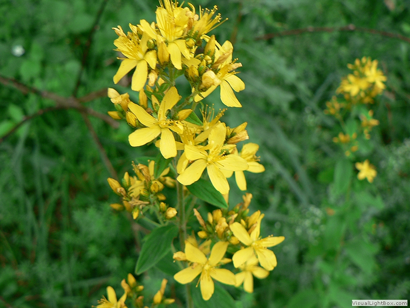 Blüten mit fünf goldgelben Kronblättern, die Hypericin enthalten, das als Antidepressivum angewendet wird, beim Zerreiben