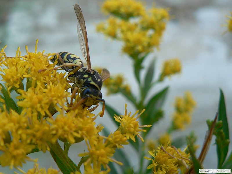 bevorzugen offenes, warmes Gelände, gern in Siedlungsbereichen, Hinterleib gelb gestreift, zwei auffällige gelbe Flecken auf