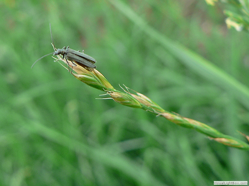 zu finden Mai bis Juli auf Wiesen, Körper schmal, langgestreckt, graugrün, matt, Flügeldecken punktiert, nach hinten sich