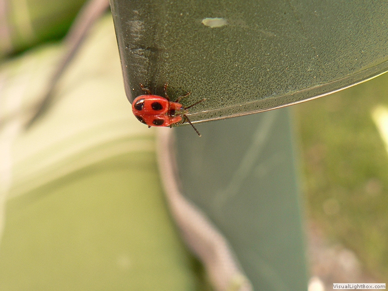 Die rote Farbvariante hat zwei schwarze Punkte auf den Flügeldecken, ein weißes Halsschild mit schwarzer Zeichnung,