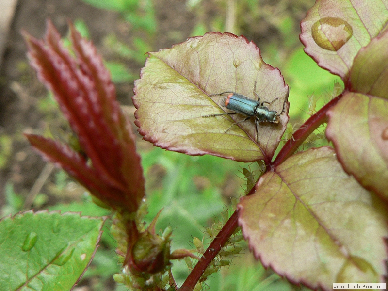 Thorax schwarz, Flügeldecken leuchtend rot mit Längsreihen und punktiert Die mittellangen Fühler mittellang und