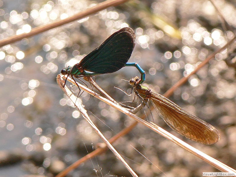 Blauflügel-Prachtlibelle (Calopteryx virgo), Tussenhausen, 31.05.2017 (2), 05.08.2018 (3), 09.08.2018 (2), 11.08.2018 (2), 22.08.2018 Paarung; |
