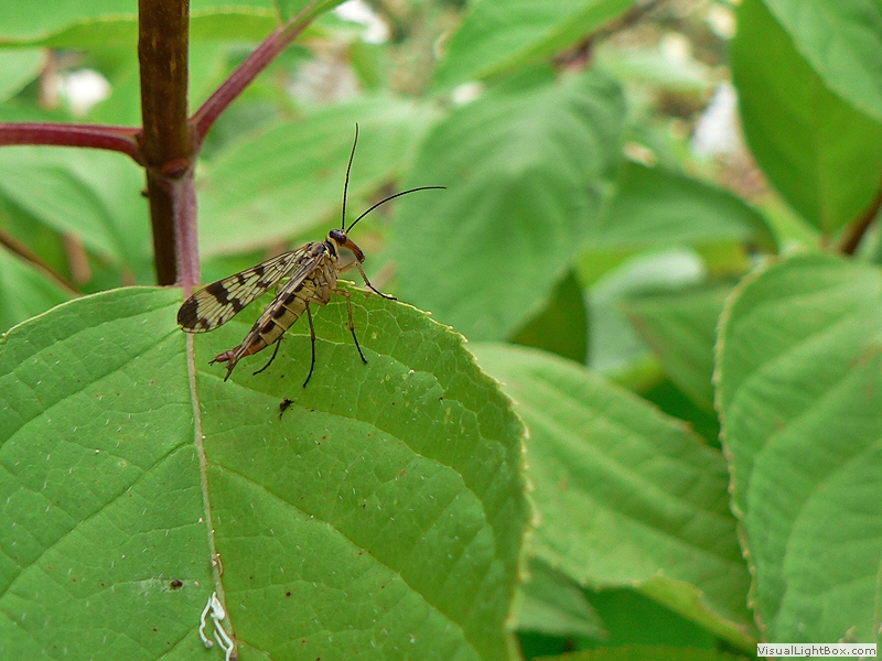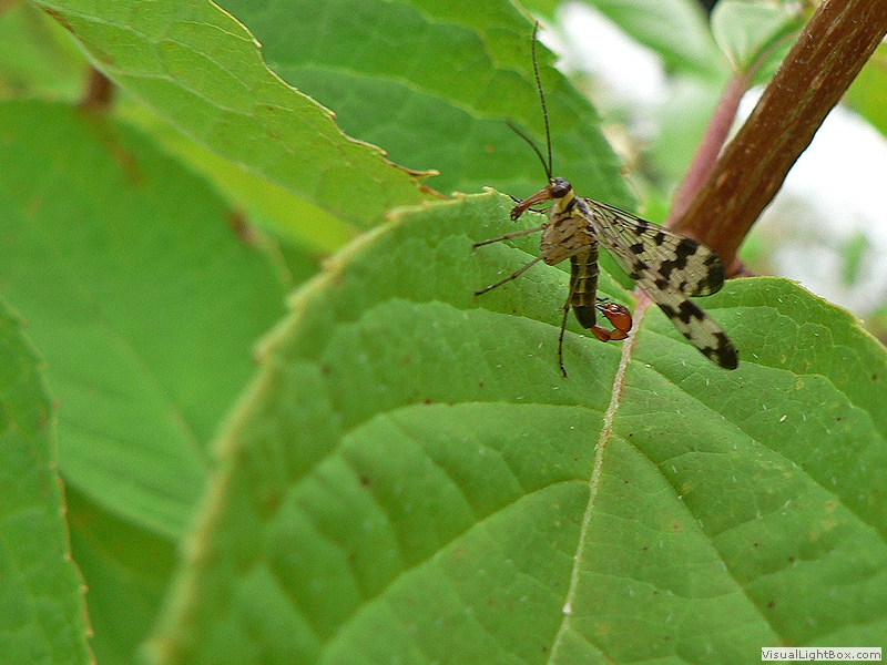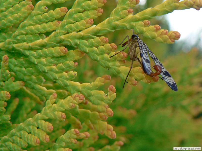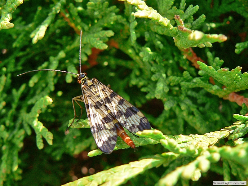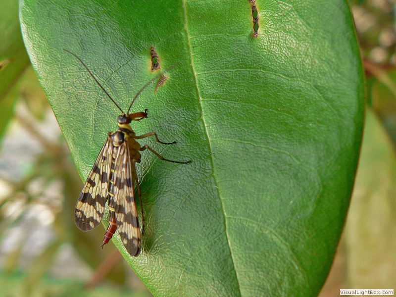 Eine von drei europäischen Familien der Schnabelfliegen sind die Skorpionsfliegen, von denen es weltweit etwa 100 Arten gibt. Der deutsche Name leitet sich von dem Kopulationsorgan der männlichen Exemplare ab. So gefährlich das an den Stachel eines Skorpions erinnernde Hinterteil auch wirkt, einen Stachel sucht man bei Skorpionsfliegen vergebens, die Tierchen sind völlig harmlos. Weibchen haben am Hinterleibsende eine Legeröhre. Skorpionsfliegen besitzen einen schnabelartig verlängerten Kopf mit den Mundwerkzeugen, vier netzartig gemusterte Flügel, die in Ruhestellung leicht gespreizt nach hinten angelegt werden.Anzutreffen sind Skorpionsfliegen bevorzugt an kühleren Orte wie schattige, feuchte Wälder oder Waldränder. Ihre Nahrung besteht vorwiegend aus toten oder verletzten Insekten. Skorpionsfliegen haben ein sehr interessantes Sexualverhalten. Sie paaren sich meist mit mehreren Partnern. Die Männchen sondern aus ihrem Genitalsegment am Ende des Hinterleibes Sexuallockstoffe aus und verbreiten diese mit ihren Flügeln. Mit Geschenken wie Futterresten oder Speichelsekret locken sie die Weibchen an. Diese Futtergeschenke sind für die Weibchen Qualitätsmerkmal der Männchen. Die Paarung selbst kann sich über bis zu zwei Stunden hinziehen. Nach ca. vier Tagen legen die Weibchen 50 bis 60 Eier in schattigen und feuchten kleinen Spalten im Boden ab. |