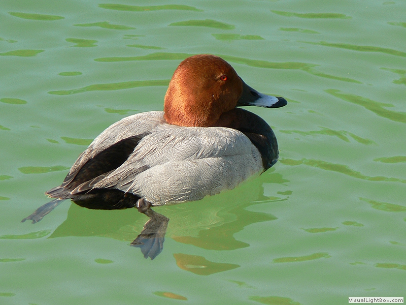 Prachtkleid eine kräftig kastanienbraune Kopffärbung, Schnabel schwarz mit graublauer Schnabelbinde, die Augen sind rot,