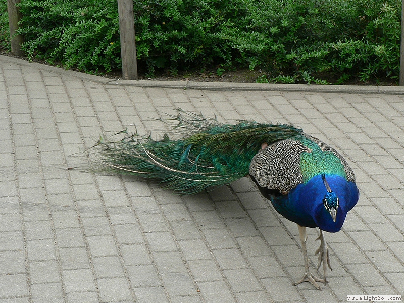 Oberschwanzdeckfedern können zu einem fächerförmigen Rad aufgestellt werden, Hahn an Hals, Brust und Bauch leuchtend blau,