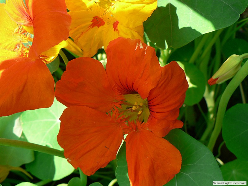 Die Große Kapuzinerkresse bildet bis zu drei Meter lange Ranken, während die Kleine Kapuzinerkresse (Tropaeolum minus)