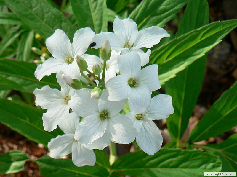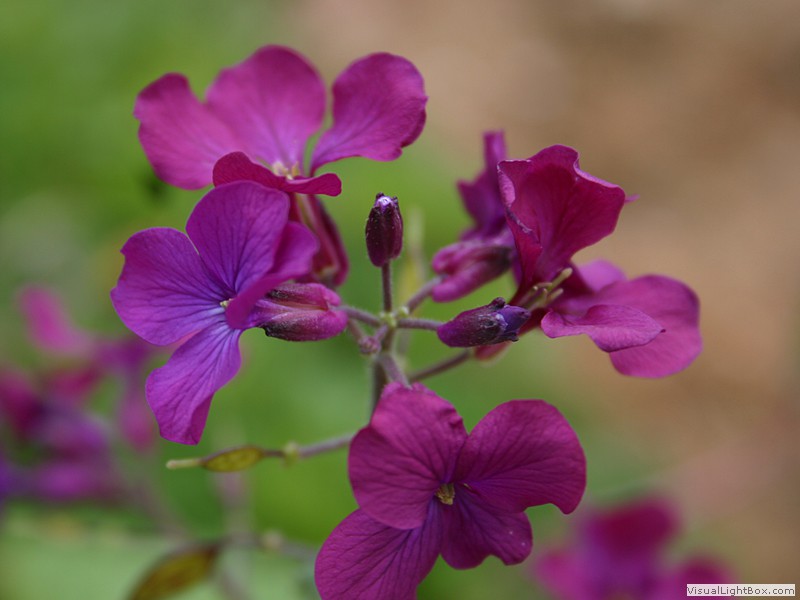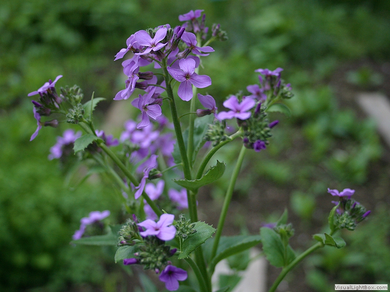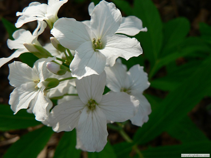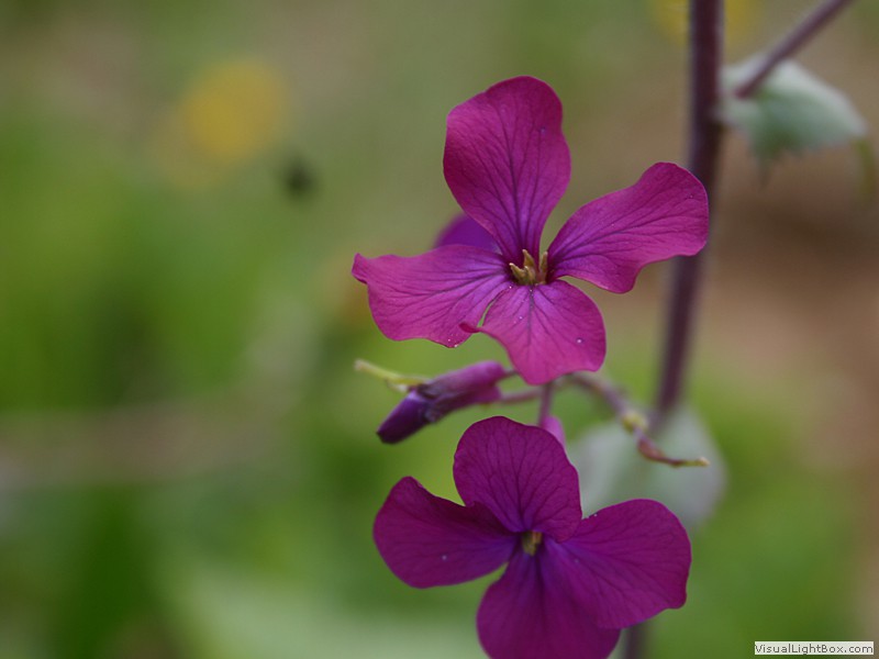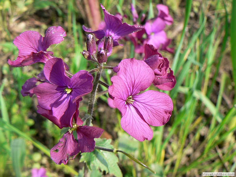Blütezeit April bis Juni, Blüten vierzählig, meist purpur-violette, selten weiße Kronblätter, entgegen dem Namen