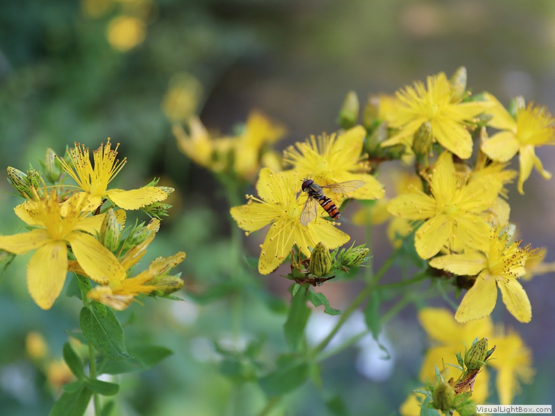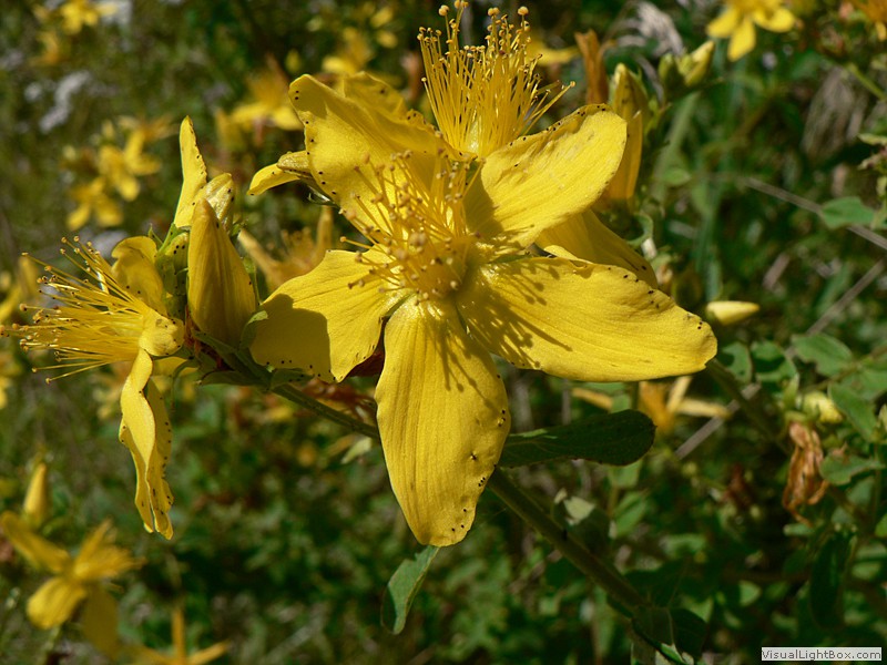 Blüten mit fünf goldgelben Kronblättern, die Hypericin enthalten, das als Antidepressivum angewendet wird, beim Zerreiben