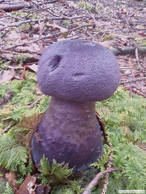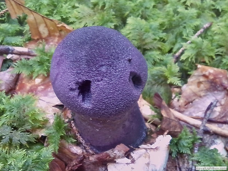 Der komplette Pilz ist von intensiv blauvioletter Farbe, Hut kugelig, im Alter flach, Hutoberfläche schuppig, Stiel an der