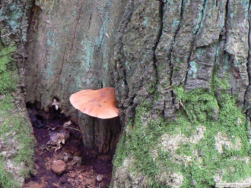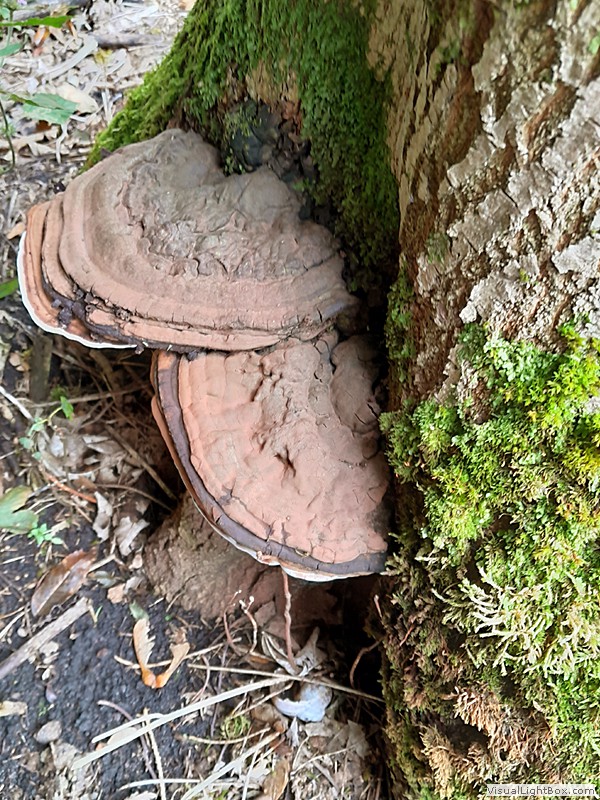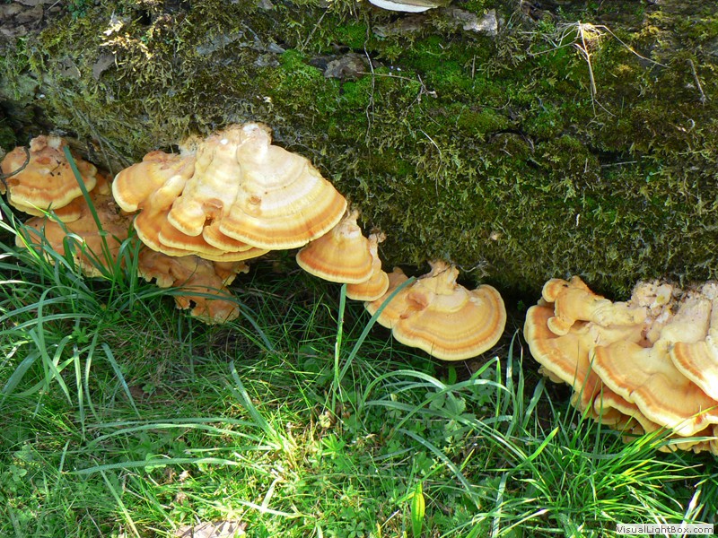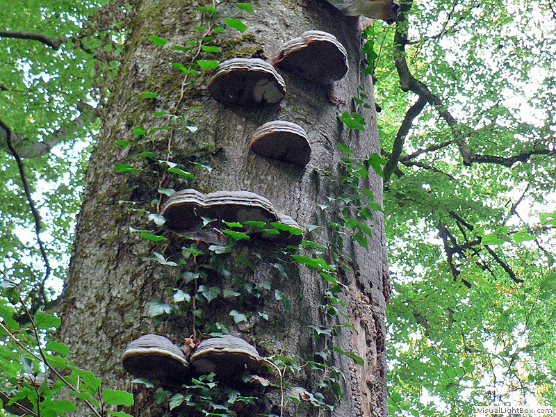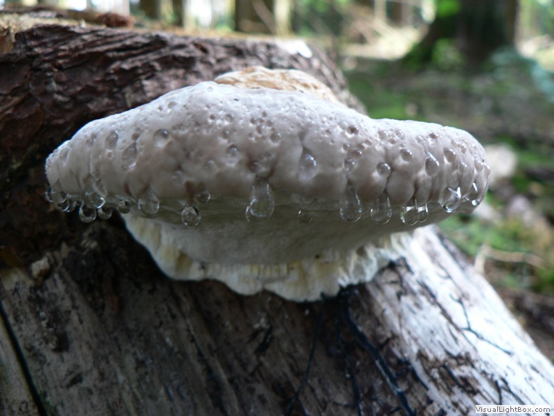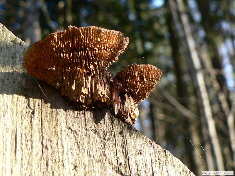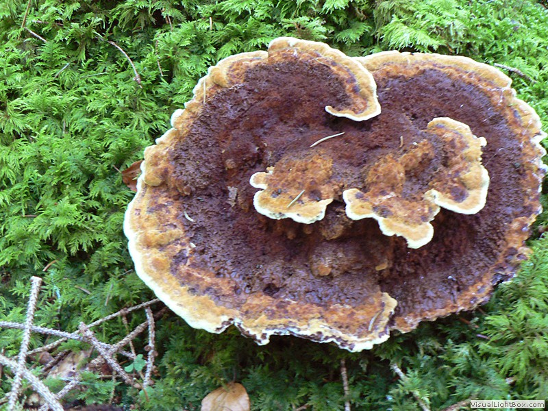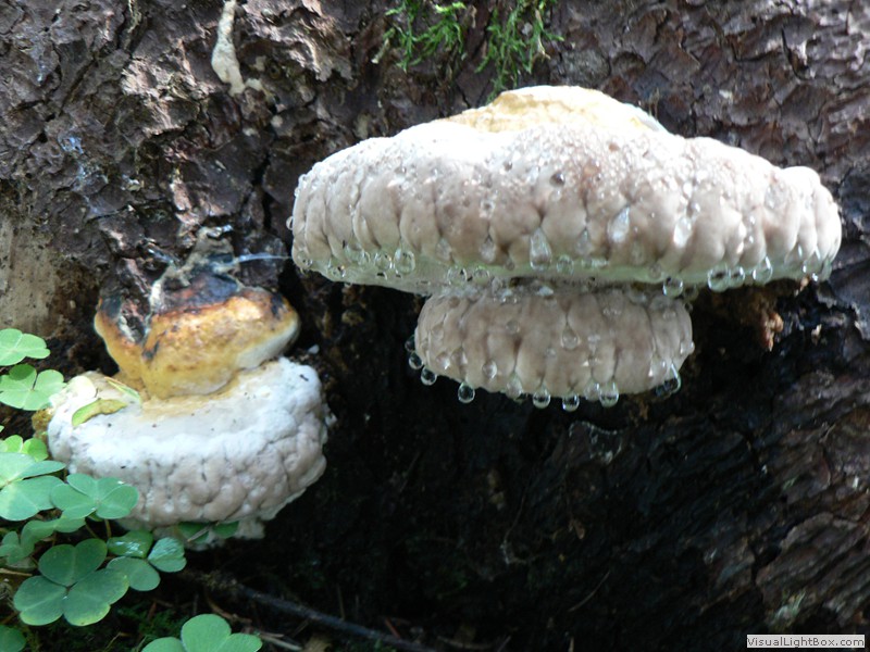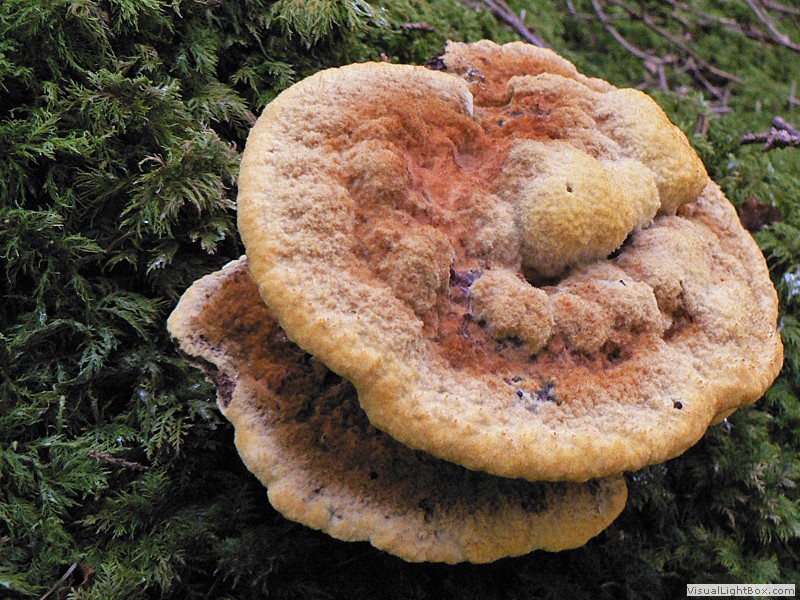 Nadelbäume, und bildet an den Stämmen dicke, konsolenförmige Fruchtkörper, die einen Durchmesser von bis zu 30 cm