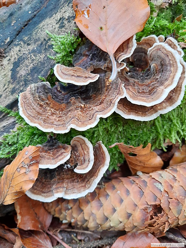 auch den Namen Bunte Tramete gab; der Hutrand ist wellig, gebuchtet, die weiße Unterseite der Hüte ist mit kurzen