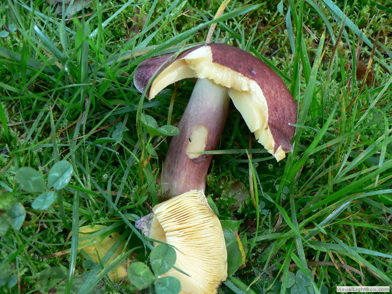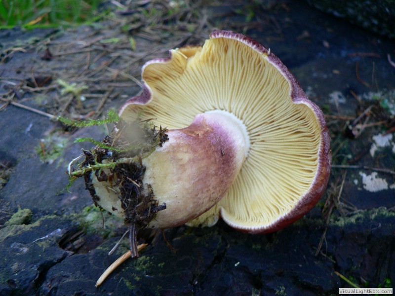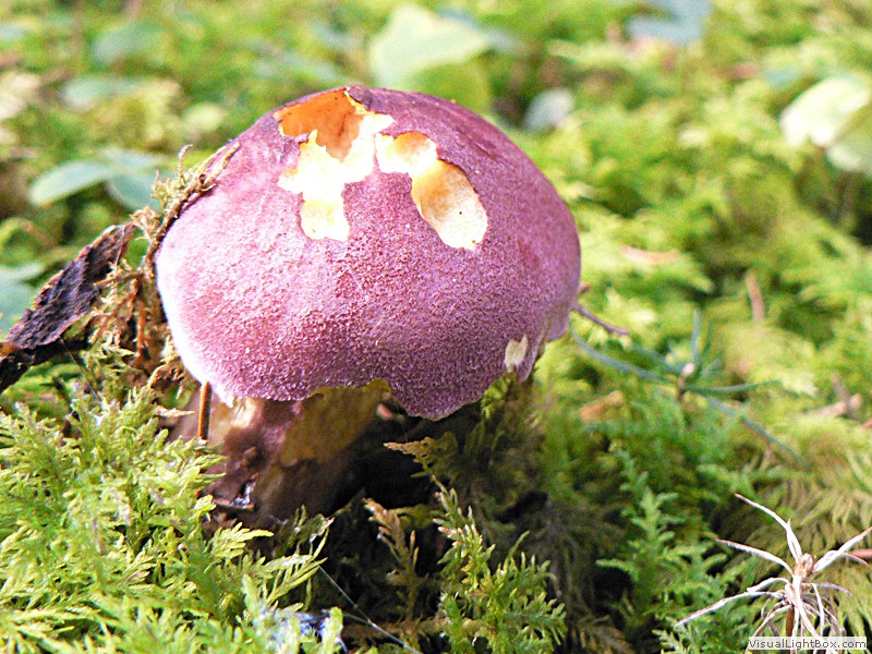 Folgezersetzer, farbig auffälliger Pilz, Hut rot bis violett-rötlich geschuppt mit gelblicher Grundfarbe, Fruchtfleisch gelb,