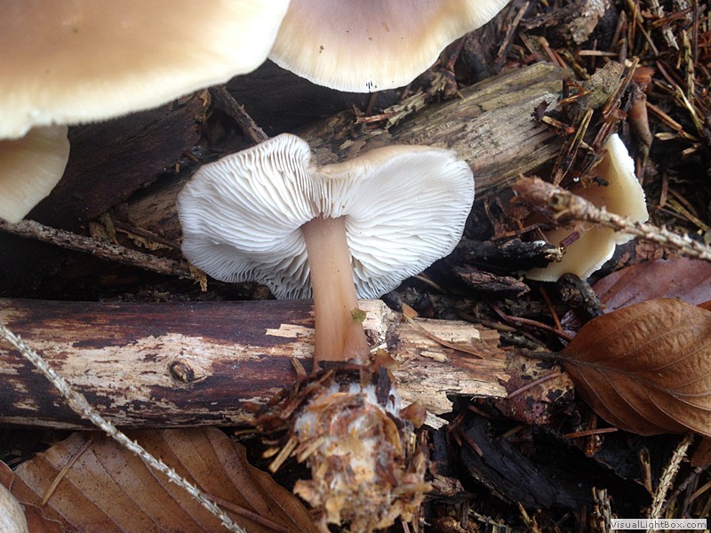 oft nach oben, die Lamellen sind weisslich blass bis cremefarben, die Stiele sind zäh, Farbe hellbraun, an der Basis dunkler.