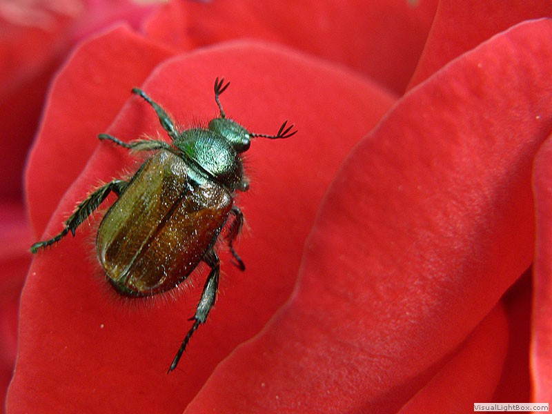 wird auch als Gewöhnlicher Rosenkäfer bezeichnet, Flugzeit April bis September, Merkmal ist die metallisch grüne bis golden