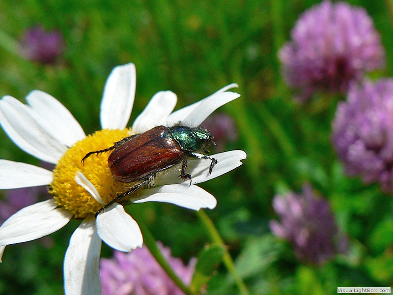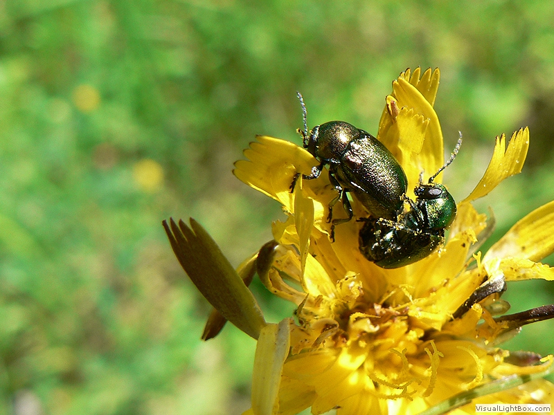 zu finden Mai bis August auf Wiesen, gern auf gelben Korbblütengewächsen wie Habichtskraut, Körper metallisch grün,