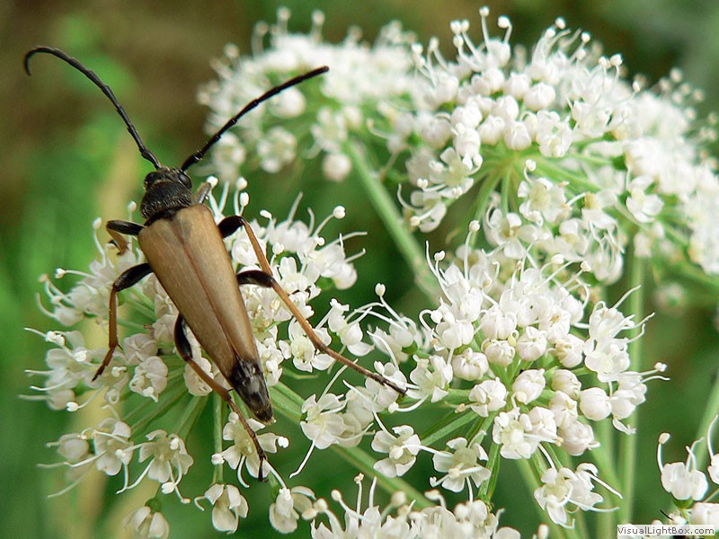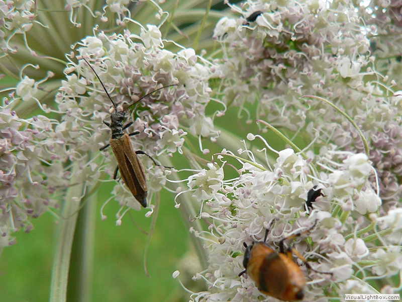 auf blühenden Pflanzen, gern auf Dolden, Kopf, Halsschild, Beine und Körper schwarz, Deckflügel braun mit dunkler Spitze,