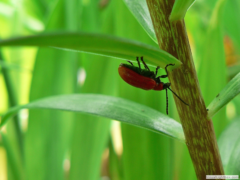 Deckflügel und Halsschild kräftig rot gefärbt, der übrige Körper und der Kopf schwarz, letztes Tarsenglied rotbraun,
