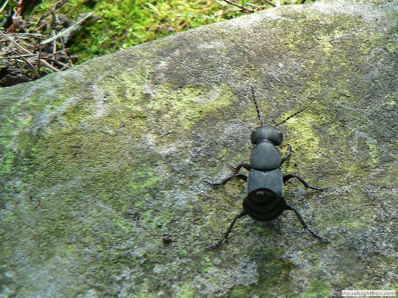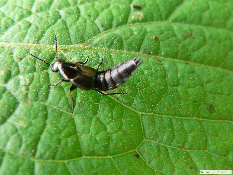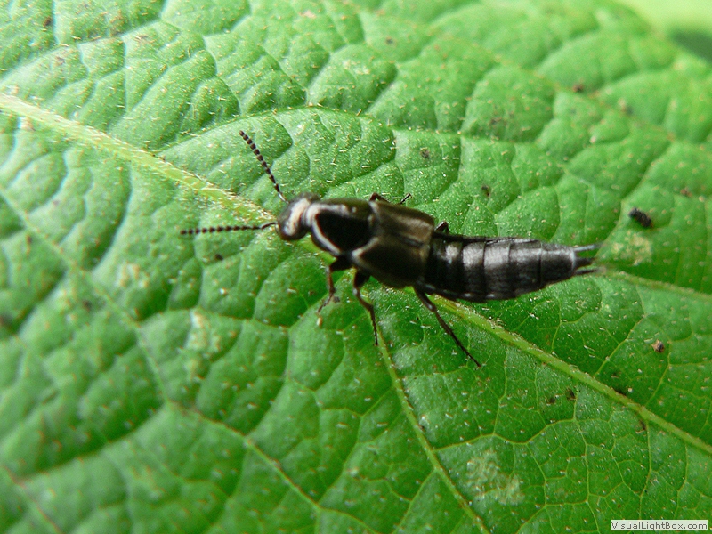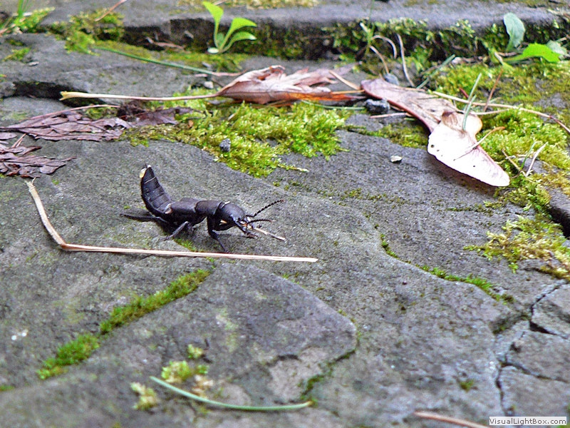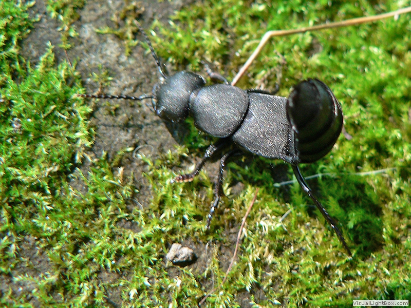 mattschwarz, Kopf groß mit kräftigen Oberkieferzangen, hebt als Drohgebärde bei Störungen das Ende des Hinterleibs