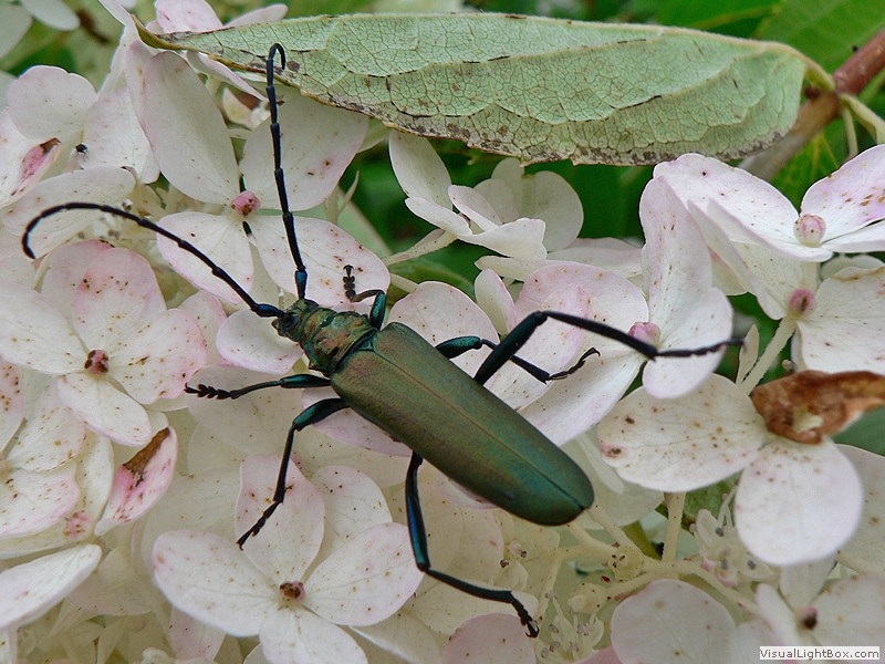 auch Gemeiner Schmalbock oder Schwarzschwänziger Schmalbock, zu finden Mai bis September an sonnigen Waldrändern, in Parks