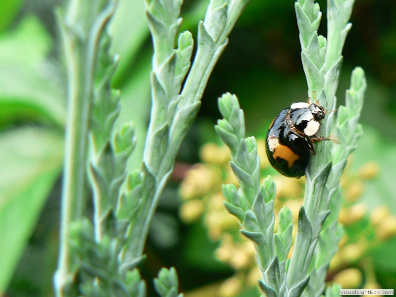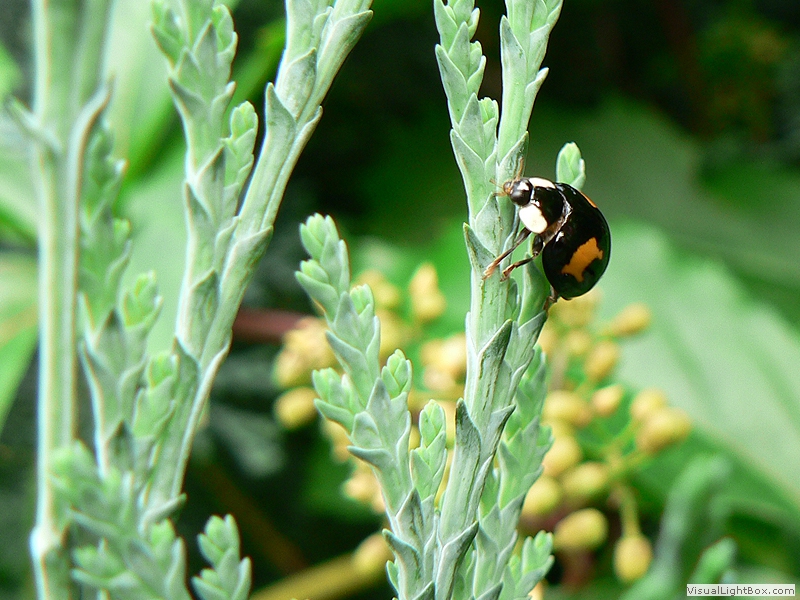 zu finden auf Nadelholz wie Kiefern, Fichten, Lärchen, Wacholdern, Deckflügel schwarz, je zwei rote, manchmal auch gelbe
