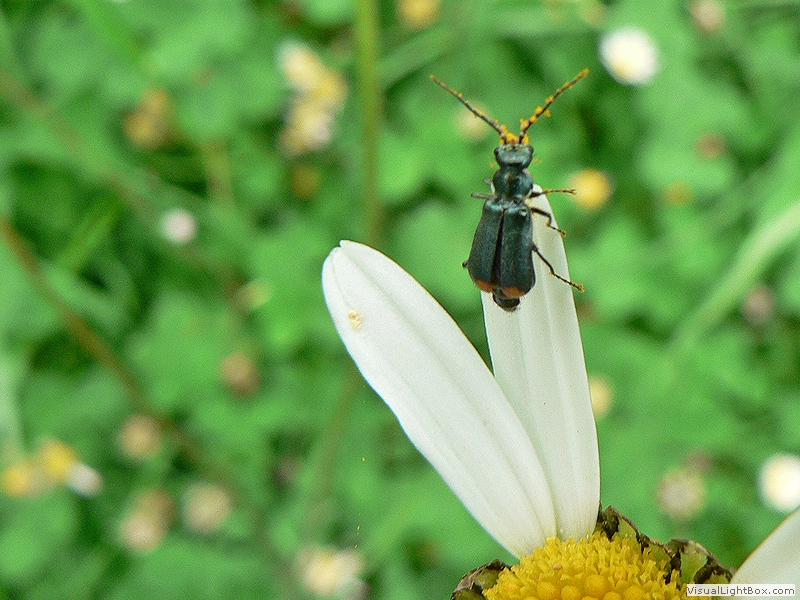 von Mai bis September auf Blüten, vor allem von Korb- und Doldenblütlern, zu finden, Körper schwarz, Flügeldecken