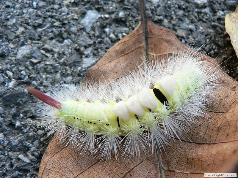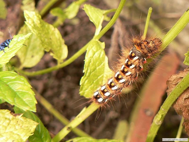männliche Raupen haben gelbe Bürsten, bei weiblichen Raupen sind die Haarbüschel auf der Rückenmitte braun.
