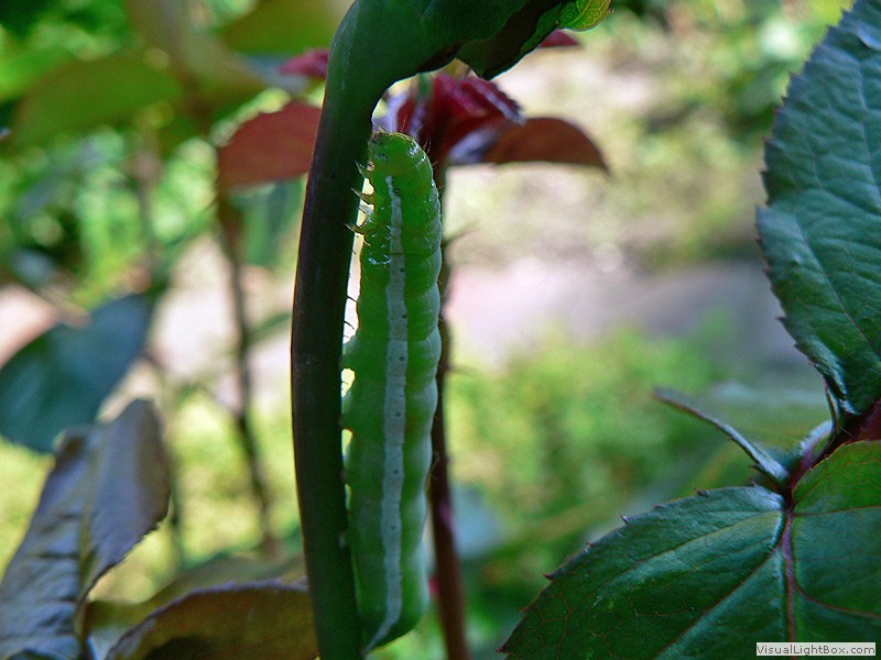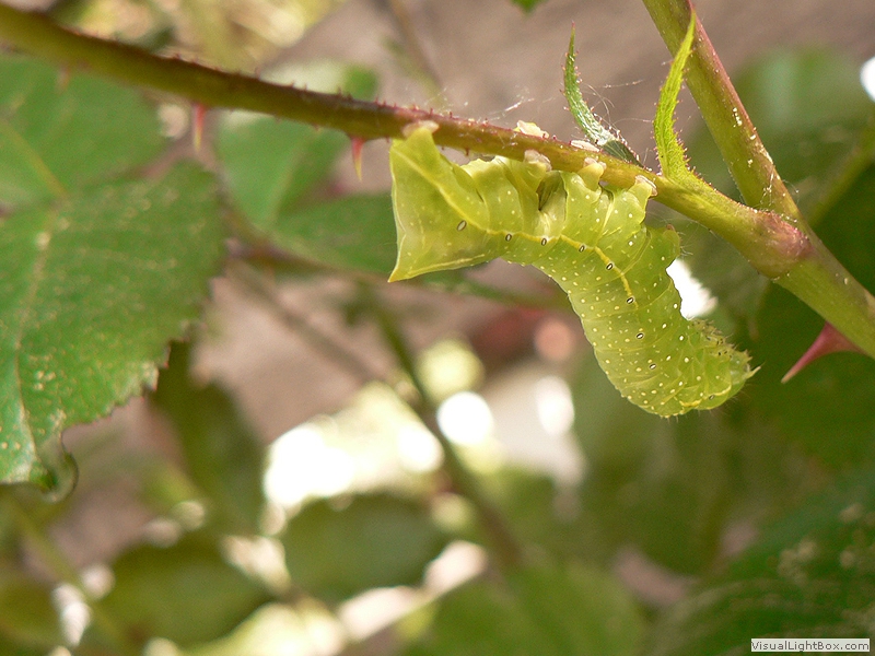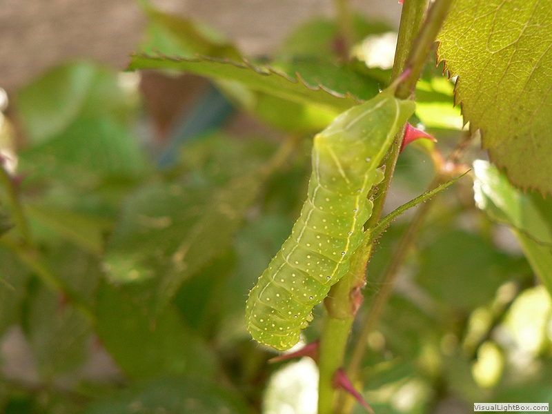 die Raupe wird bis zu 40 mm lang, grüner Körper, an den Seiten breites, weisses Band, auf dem Rücken drei