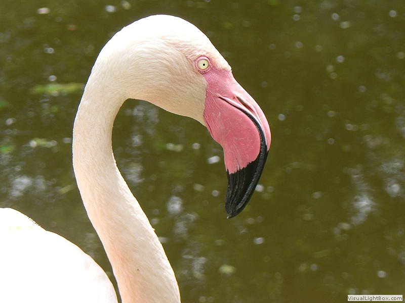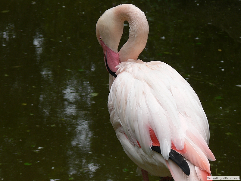 rosa Gefieder, langer Hals, beide Geschlechter sind gleich gefärbt, Männchen sind etwas größer als Weibchen, ernähren sich