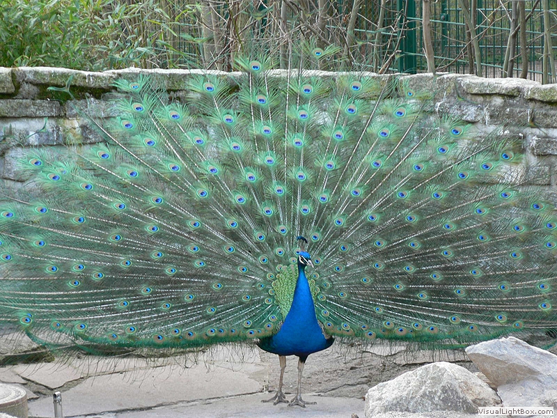 Oberschwanzdeckfedern können zu einem fächerförmigen Rad aufgestellt werden, Hahn an Hals, Brust und Bauch leuchtend blau,
