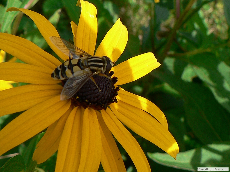 wird auch als Gewöhnliche Sonnenschwebfliege bezeichnet, Größe 10 bis 14 mm, vier gelbe Längsstreifen auf dem Thorax,